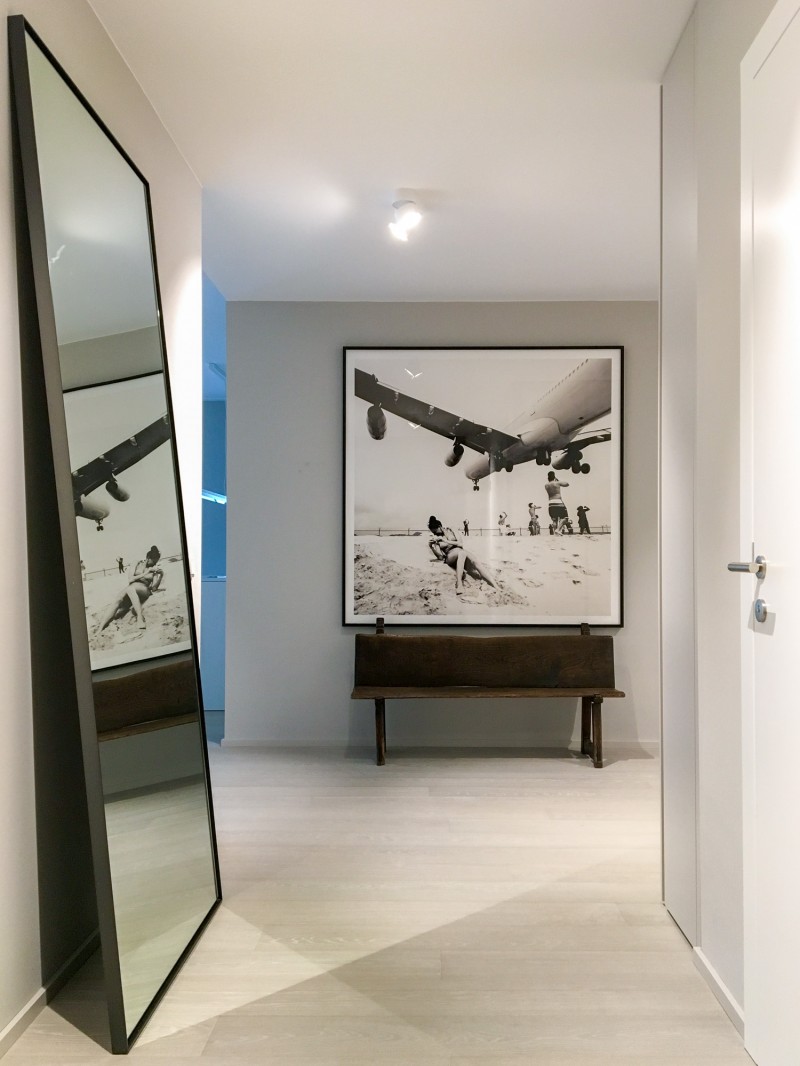 Die Wohnung ist nichts desto trotz schlicht, modern und wurde mit einigen alten Möbeln und viel Kunst zum Leben erweckt. Warme Grautöne und Statement-Pieces wie der bodentiefe Spiegel und große Poster und Kunstleinwände sind in der ganzen Wohnen die Kernelemente des Interior Designs.