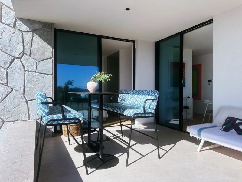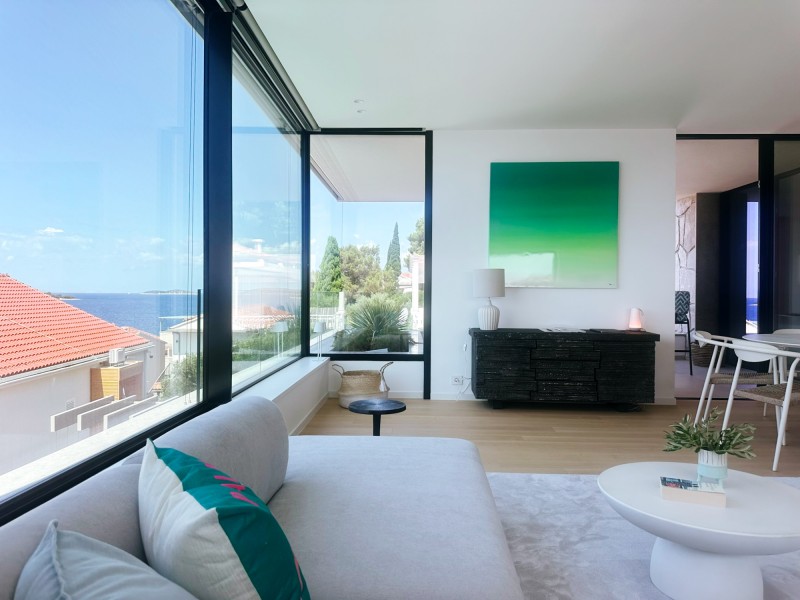 Schon beim Betreten des Vorraums eröffnet sich der Blick – unmittelbar auf das endlose Blau des Meeres, das hier zum Greifen nah scheint. Von Anfang an war klar: das Interior musste dezent und zurückhaltend bleiben. Nichts sollte den Blick übertreffen, vielmehr sollte er in seiner ganzen Wirkung unterstrichen werden.