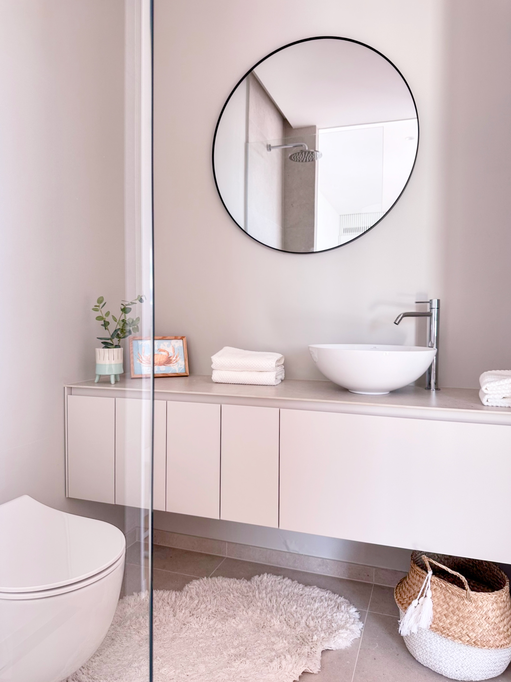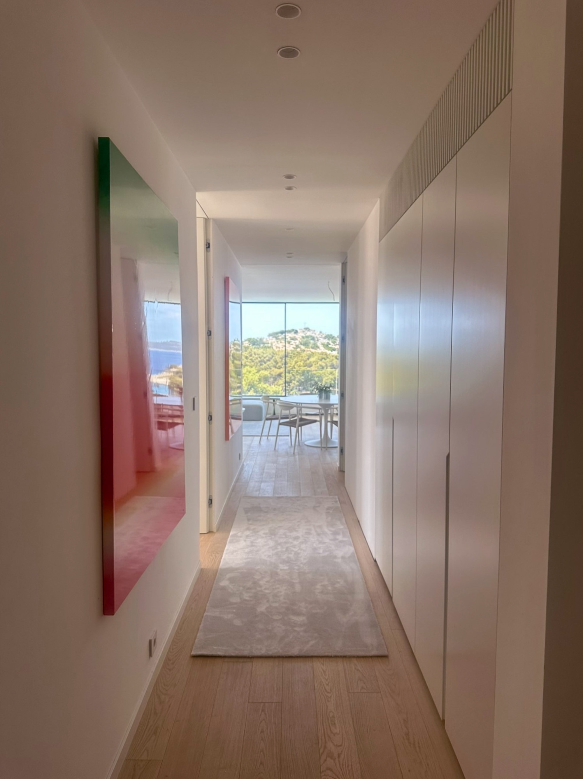 Helle, sanfte Nuancen in Blau, Türkis und Grau schaffen eine Atmosphäre der Leichtigkeit und Ruhe – Farben, die den Sommer spürbar machen und das Gefühl des Meeres in die Räume tragen. Auch in den Schlafzimmern setzt sich dieses Konzept fort: zarte Textilien, harmonische Farbtöne und ausgewählte Kunstwerke verschmelzen zu einem stimmigen Gesamtbild.